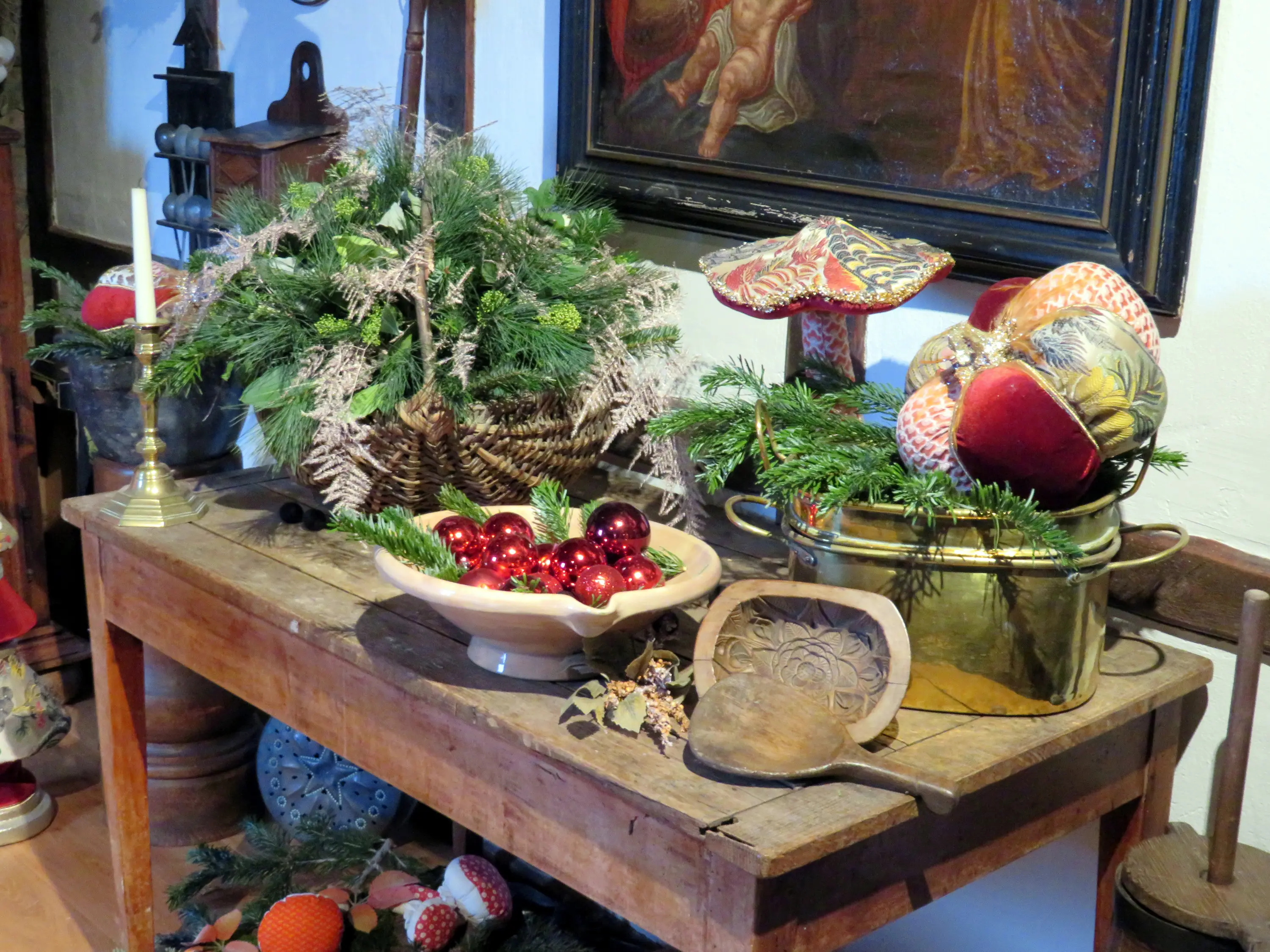 Table en bois à pieds sculptés en colonnes torses sur laquelle est posée une guirlande naturelle de sapin frais ornée de boules de Noël, à proximité d’un fauteuil en bois sombre garni d'une assise en velours rouge profond.