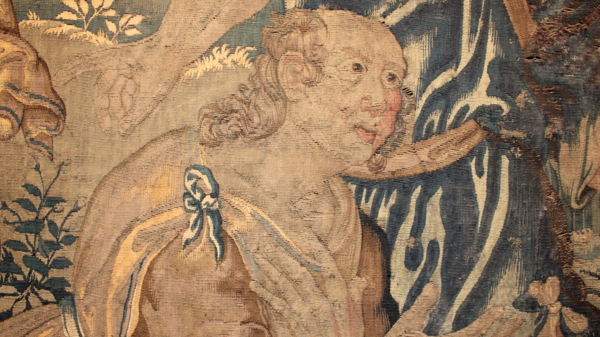 Fragment de la tapisserie du Cycle d’Alexandre le Grand, tissée à Audenarde à la fin du XVIe siècle et exposée dans la salle des Chevaliers du château de Reinhardstein, représentant un berger identifiable grâce à sa houlette, sa musette et sa pétase.